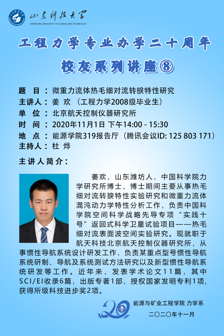 工程力学专业办学二十周年校友系列讲座之八——微重力流体热毛细对流转捩特性研究